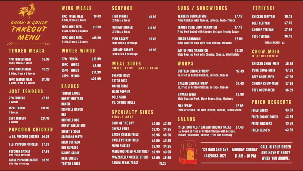 Introducing the menu at Chick-n Grille, located in the heart of Pittsburgh, offers a delightful range of American comfort food that will satisfy your cravings. The standout items include their famous wing meals, featuring whole wings served with a choice of sides and sauces at an unbeatable price.